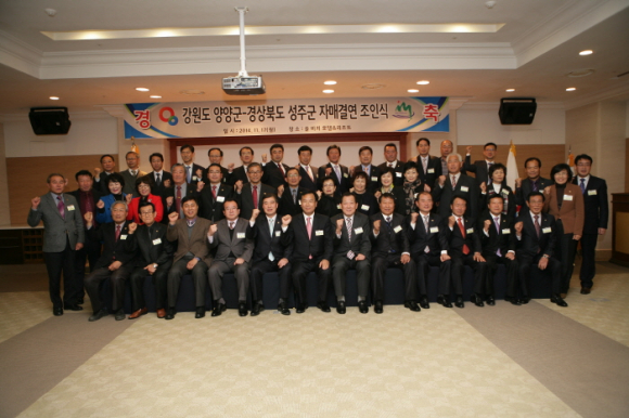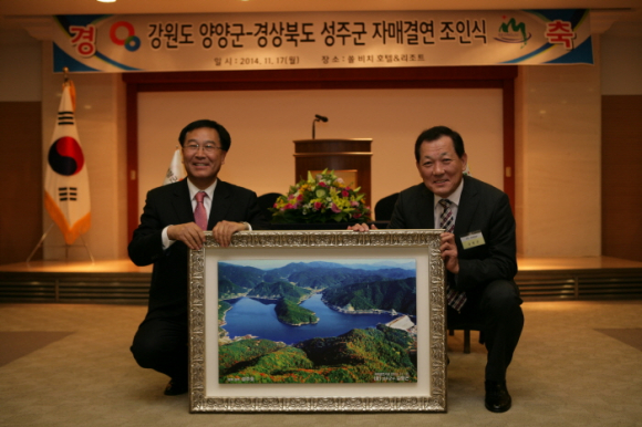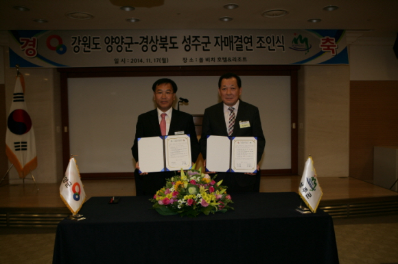 |  | | | ⓒ GBN 경북방송 | | 성주군(군수 김항곤)은 양양군(군수 김진하)과 지난 17일 양양 쏠비치호텔에서 양 자치단체간 우호증진과 교류활성화를 통한 공동발전 방안을 모색하기 위하여 자매결연 조인식을 가졌다고 밝혔다.