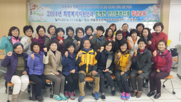 성주군(군수 김항곤)은 11월 16일 40여명이 참여한 ‘2014년 희망복지지원단과 함께한 민간협력단체 힐링교육’을 국립영덕청소년해양환경체험센터에서 실시하였다.