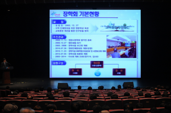 |  | | | ⓒ GBN 경북방송 | | 탄탄한 장학기금 조성과 내실있는 장학사업으로 키움과 나눔을 실천하고 있는 재단법인 영천시장학회(이사장 김영석)는 지난 19일 영천시민회관에서 김영석 영천시장을 비롯한 도의원, 교육장, 관내 기관단체장 및 학교장, 학생, 시민 등 600여명이 참석한 가운데 2014년 장학사업 시민보고회를 개최하였다.