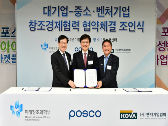 |  | | | ↑↑ 포스코는 25일 서울 포스코 센터에서 제8회 아이디어 마켓플레이스를 개최하고 미래창조과학부, 벤처기업협회와 함께‘대기업-중소·벤처기업 창조경제협력’을 위한 협약식을 체결했다.(사진왼쪽부터 권오준 포스코 회장, 최양희 미래창조과학부 장관, 남민우 벤처기업협회장) | | ⓒ GBN 경북방송 | | 포스코(회장 권오준)가 자체적으로 벤처기업을 육성하는 것을 넘어 민관합동으로 추진하는 벤처활성화 지원사업에도 참여해 창조경제 실현에 앞장선다.