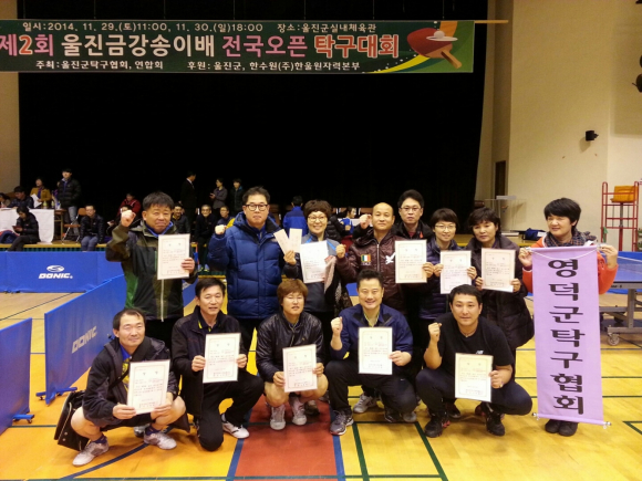 |  | | | ⓒ GBN 경북방송 | | 지난 11월 29일과 30일 울진군 실내체육관에서 양일간에 걸쳐 펼쳐진 제2회 울진금강송배 전국오픈 탁구대회에서 영덕군 탁구 연합회가 1위와 3위의 성적을 거두는 쾌거를 거두었다.