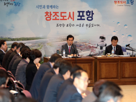 이강덕 시장은 “지난 1일 포항시의회에서 가진 시정연설에서 창조도시 포항 건설의 목표로 오는 2018년까지 인구 60만, 1인당 지역내총생산(GRDP) 4만5천불을 설정하고, 이를 위해 경제 활성화에 집중하기 위한 조직개편안을 마련했다.”고 전제하고, “단순히 건전한 조정자의 역할을 하는 행정을 넘어 절박한 심정으로 주식회사 포항을 살리기 위한 적극적인 행정이 필요하다.”고 강조했다.