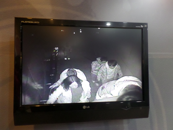 극장 문이 열리자 사람들이 쏟아져나오고 피부에서 붉은빛이 번져
