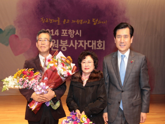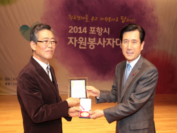 9일 문화동 대잠홀에서 열린 ‘2014 자원봉사자대회’ 에서 올해의 봉사왕으로 선정된 최원일(만62세) 씨가 지역인재육성 장학기금 1억원을 기탁했다.