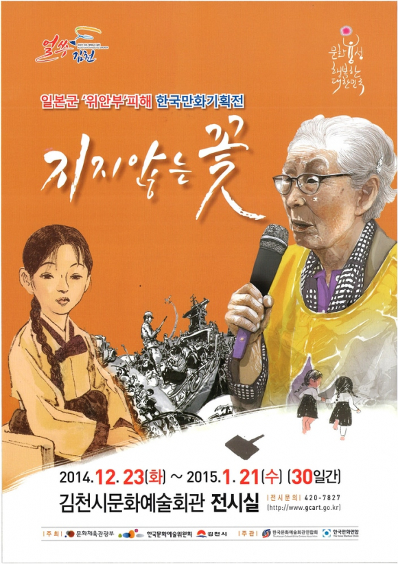 김천시(시장 박보생)는 오는 12월 23일(화)〜2015. 1.21일(수) 30일간 위안부 피해자의 아픔을 만화로 그린 ‘지지않는 꽃’ 한국만화기획전을 문화예술회관 전시실에서 개최한다.