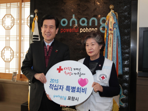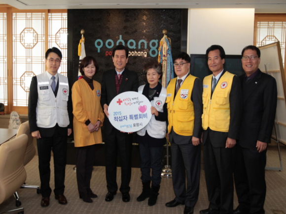 이강덕 포항시장은 12일 대한적십자사 경북지사 손덕임 부회장을 비롯한 임직원들이 포항시청을 방문한 가운데 도내 23개 시·군 가운데 가장 먼저 적십자 특별회비를 전달했다.