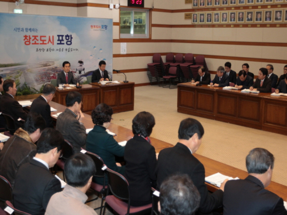 이강덕 포항시장은 22일 열린 간부회의에서 “올해는 창조도시추진위원회 설치 및 조례 제정, 분과위원회 운영 등 창조도시 포항 건설에 기반을 다진 한 해”라며 “조직 개편, 예산 통과 등 묵묵히 맡은 일을 충실히 임해준 2천여 공직자들에게 감사를 전한다”고 말했다.