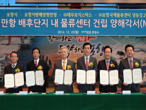 포항시는 22일 시청 대회의실에서 (주)대우로지스틱스와 (주)포항국제물류센터·냉동창고의 포항영일만항 배후단지 내 물류센터 건립에 관한 양해각서(MOU)를 체결했다.