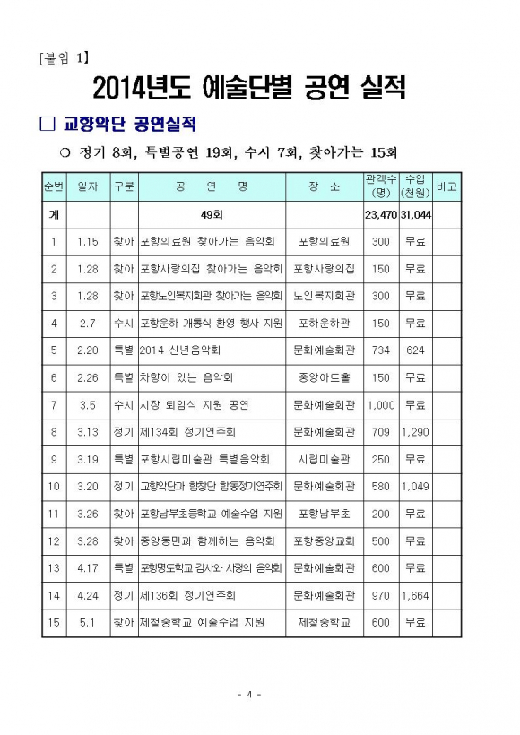 포항시 관계자는 “더욱 변화된 시립예술단을 만들기 위해 내년부터 시립예술단원 보수를 6% 인상해 단원의 사기를 진작시키고, 공연수당의 횟수도 1회 늘여 기업체 등 찾아가는 공연을 활성화시킴으로써 침체된 경기를 활성화하는데 힘을 보탤 예정”이라고 말했다.