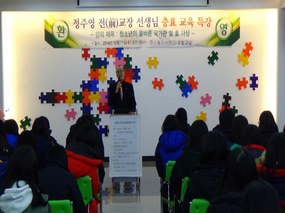 이번 강좌의 어르신강사는 평생을 교육자로 재직하다 퇴임 후 지역의 문화진흥 및 노인들을 위한 다양한 봉사활동을 펼치며 지역민들의 존경과 신망을 얻고 있는 정주영 선생(전 중앙여고 교장, 현 경북유네스코 경북협회장)으로, 청소년들의 마음을 살찌울 강의를 재미있게 풀어내 학생들의 좋은 반응을 얻고 있다.