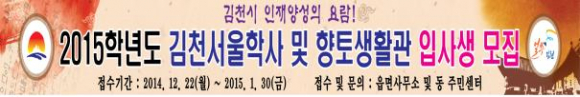 김천시(시장 박보생)는 2014년 12월 22일부터 2015년 1월 30일까지 각 읍․면사무소 및 동 주민센터를 통해 김천서울학사 및 향토생활관 입사생 접수를 받는다. 이번에 선발하는 인원은 김천서울학사 30명과 향토생활관(경북대 30, 영남대 30, 계명대 30, 대구대 30, 대구가톨릭대 50) 170명으로 선발기준은 성적 50%, 생활정도 50%로 접수인원이 선발인원을 초과할 경우에는 선발기준에 따라서 대상자를 선발할 예정이다.