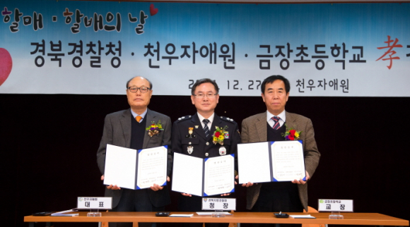 경북지방경찰청장(김치원)은 27일 오전 10시, 경주 현곡면 소재 천우자애원에서 경주경찰서장 및 경찰관, 금장초등학교 교장 및 학생과 함께 자애원 어르신 등 110명이 참석한 가운데 <경북경찰청-천우자애원-금장초등학교간 孝 결연식>을 가졌다.