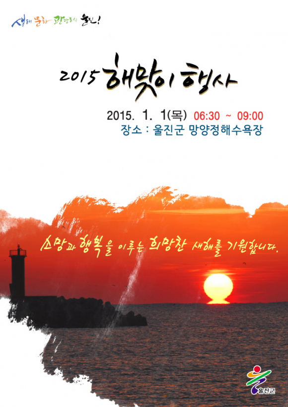 관동팔경 망양정에서 을미 해 소원 ! 함께 빌어요” “망양정에 올라 소원, 건강, 행복 두손 모아 함께 빌어요” 울진군(군수 임광원)은 2015년 1월 1일(을미년) 새해 첫날 망양정 해수욕장에서 해맞이 행사를 개최 한다고 밝혔다.