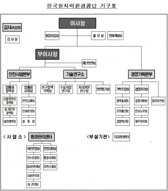 그동안의 건설중심에서 벗어나 ‘방폐물 관리와 방사선 안전관리’에 적합한 조직 구조를 만들기 위해 안전운영본부와 미래사업본부를 안전사업본부로 통합하고, 처분시설 운영과 방사선 안전관리로 무게중심을 옮기도록 했다.