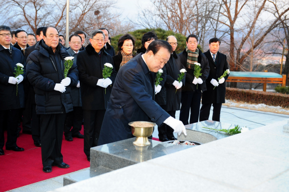 이날 참배는 을미년 새해아침을 맞아 조국을 위해 산화한 호국영령들의 명복을 빌고 금년 한 해도 김천시민의 무궁한 발전과 안녕을 기원하면서 활기찬 시정을 펼칠 수 있도록 각오를 다짐하기 위해 마련했다.