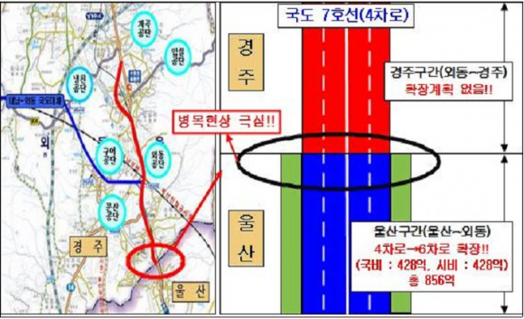 현재도 하루 종일 지체되어 물류비용이 너무 많이 소요되고 있는 울산·경주 경계구간에서의 병목현상은 극심해져 교통체증이 가중될 것이라는 게 정 의원의 주장이다(그림 참조).