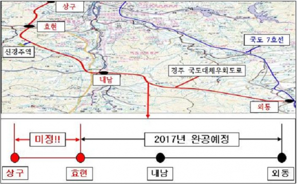 국도 7호선의 교통체증을 완화할 국도대체우회도로(국대도) 경주구간(상구~효현~내남~외동)은 2006년부터 시작하여 2017년에 완공 될 예정이었다.