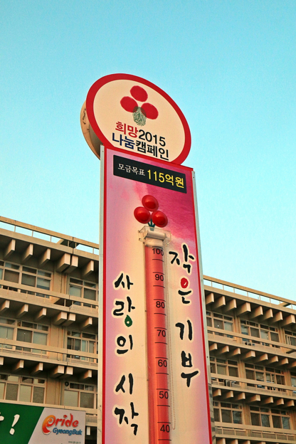경북도청 앞마당에 설치된 사랑의 온도탑이 100도를 가리키고 있다. 경북사회복지공동모금회(회장 신현수)의 ‘희망2015나눔캠페인’ 사랑의 온도탑 수은주가 100도를 돌파했다.
