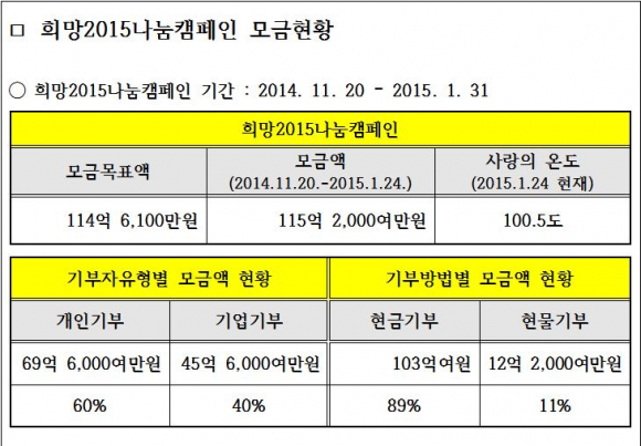 - 경북사회복지공동모금회 ‘희망2015나눔캠페인’, 1월 24일 기준, 모금액 115억 2천여만원, 목표액보다 6,000여만원 초과해 100.5도 기록 - 1998년부터 연말연시 불우이웃돕기 ‘희망나눔캠페인’ 추진 이래 최대 모금액 달성