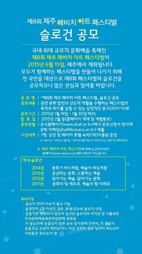 문화체육관광부의 후원으로 진행되는 이번 공모전은 국내 최대 규모의 문화예술 축제인 ‘제8회 제주 해비치 아트 페스티벌’에 대한 관심과 참여를 제고하기 위해 마련되었다. 공모전 주제는 ‘공연 예술 발전의 선도적 역할을 수행하는 페스티벌’을 나타내는 상징적인 문구이며, 페스티벌에 관심이 있는 사람은 누구나 참여할 수 있다.