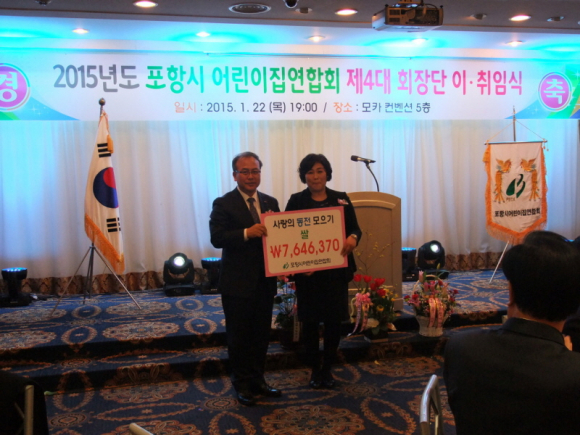 포항시 어린이집연합회가 지난 22일 웨딩아이린에서 열린 ‘제4대 회장단 이취임식’에서 설명절을 앞두고, 소외 계층을 위한 사랑의 쌀 나누기에 동참하기 위해 성금 764만 6,370원을 포항시에 전달했다.