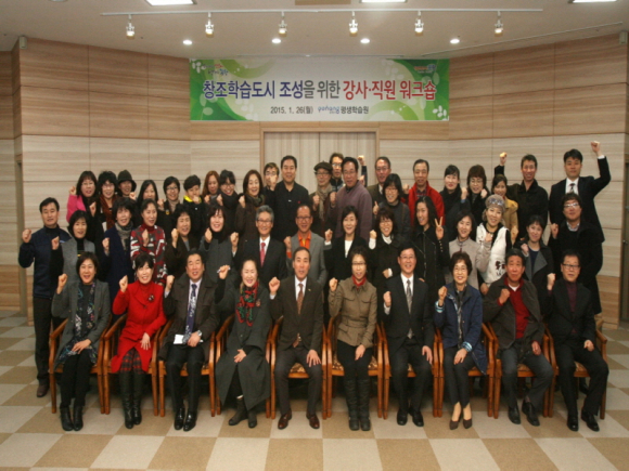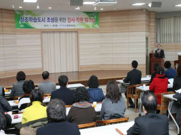 이날 워크숍에서는 신희욱 평생교육과장이 2015년도 교육운영방향과 전략사업에 대한 설명을 시작으로 황병한 평생학습원장이 창조도시 건설을 위한 평생학습원의 비전과 전략에 대한 특강을 진행했다.