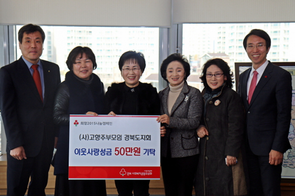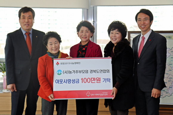 이 날, 농협경북지역본부 부본부장실에서 권기승 농협경북지역본부 부본부장, 권택필 (사)농가주부모임 경북도연합회장, 강순옥 (사)고향주부모임 경북도지회장, 김누리 경북사회복지공동모금회 사무처장 등 관계자들이 참석한 가운데, ‘희망2015나눔캠페인’ 이웃돕기 성금 전달식을 가졌다.