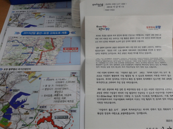 이강덕 시장 명의의 서한문은 국제규모의 컨테이너항만인 영일만항과 함께 KTX 개통 등으로 편리해진 사통팔달의 교통인프라와 쾌적한 정주여건 등 기업 활동에 편리한 포항만의 특징을 소개하고 있다.