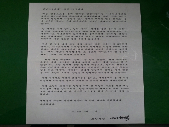 이강덕 시장은 서한문을 통해 “최근 언론 보도를 통해 알려진 인천어린이집 아동학대사건으로 인해 열악한 처우 속에서도 사명감과 꿈을 가지고 보육의 현장에서 묵묵히 일하는 많은 교사들이 사기가 저하된 것 같아 안타깝다”는 격려 메시지를 전했다.