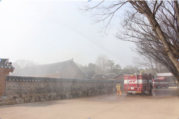 경주소방서는 11일 14시 경 경주교촌마을 내 경주향교에서 경주시, 의용소방대, 경주향교 자위소방대와 함께 중요문화재 화재에 대한 소방훈련을 실시했다. 중요문화재의 화재 발생시 소방공무원들이 신속히 출동하고 화점 접근 루트를 익히게끔 하고, 아울러 문화재 관리 주체와 자위소방대는 자체소화설비 사용을 숙달토록 하는 것이 훈련의 주된 목표이다. 14시 정각에 대성전에서 연막탄이 점화되고 1차적으로 경주향교 자위소방대가 옥외소화전을 점령, 초기진화활동을 개시하였다. 이어서 경주소방서 1차 출동대(지휘차, 중형펌프차, 펌프차, 구조공작차, 구급차)가 출동하여 진압을 시작하였고, 2차 출동대(경주시 문화재 반출차, 의소대, 물탱크차, 중형펌프차)가 추가 출동하여 화재를 완진했다. 황중근 대응구조구급과장은 “중요 문화재의 보존을 위해서는 문화재 관리자 및 자위소방대의 역할이 매우 중요하다.”며 관리주체에 의한 초기대응을 재차 강조했다. 이 날 훈련에는 총 62명(소방공무원 27명, 경주시 10명, 의용소방대 10명, 자위소방대 15명)과 소방차량 10대가 동원되었다. |
