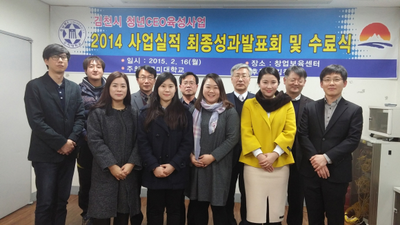 구미대학교(창업보육센터)가 주관하고 김천시가 주최하는 「2014년도 청년CEO육성사업 최종성과 발표회 및 수료식」이 지난 2월 16일 구미대학교 창업보육센터에서 개최되었다. 이 행사는 청년창업가들로 하여금 지난 한해 동안의 추진성과를 발표함으로써 사업성공에 대한 스스로의 자부심을 고취시키고, 발표에 따른 시상과 수료를 통해 그간의 사업과정을 마무리하는 자리이다.