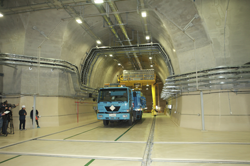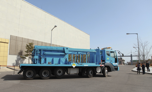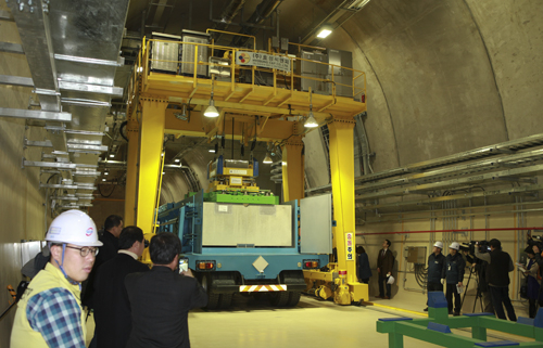 이날은 인수저장시설에서 검사를 마친 방사성폐기물 드럼이 처분용기에 담겨져 전용트럭을 통해 지하처분시설로 운반되어 사일로에 정치되는 모의운전 과정을 시연했다.