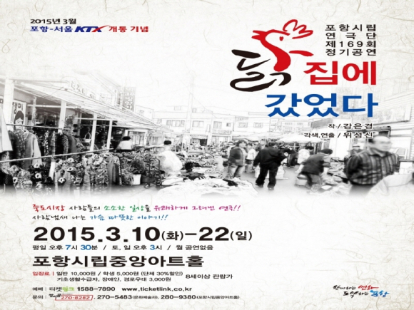 3월 KTX개통을 기념한 이번 공연 ‘닭집에 갔었다’는 극작가 겸 연출가 ‘강은경’의 원작을 새롭게 각색해 포항시의 대표시장인 ‘죽도시장’을 현실적인 무대로 설정하고, 코믹의 요소를 재배치해 신선한 재미와 감동의 무대를 만들었다.