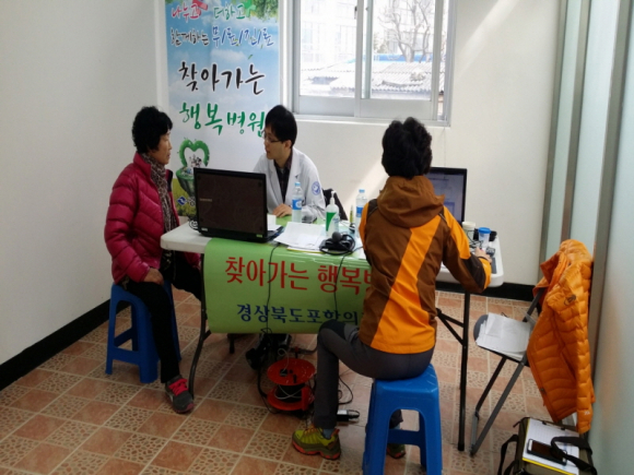 포항시 북구보건소는 26일 청하면 보건지소에서 포항의료원과 연계해 의료혜택이 열악한 오지 주민들의 건강증진을 위한 ‘2015년 찾아가는 행복병원’의 첫 진료를 시작했다.