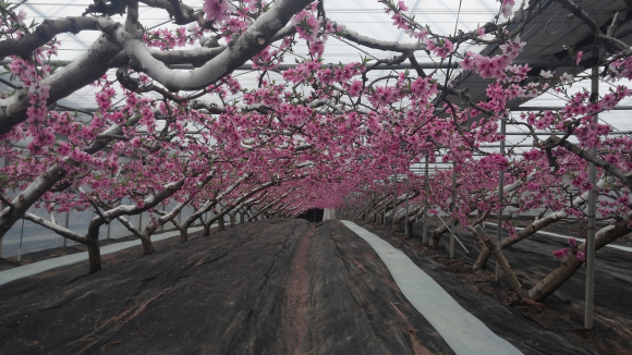 |  | | | ⓒ GBN 경북방송 | | 김천시 농소면 노곡리 최봉분(68)씨의 농장 하우스내 복숭아 꽃이 노지보다 1개월 정도 앞당겨 봄의 시작을 재촉하고 있다. 시설복숭아는 지난 1월 초순부터 가온을 시작하여 2월 중순경부터 개화를 시작하여 3월 2일 만개되어 5월 중순경 수확 예정에 있다. 금년도는 2월달 기상호조로 전년보다 4 ~ 5일 일찍 만개했다. 최씨의 농장에서는 개화기 수정율을 높이기 위해 꿀벌을 매년 사용하고 있으며 보온유지용 다겹보온커튼을 설치해 유류비 절감을 통한 생산비 절감 효과를 보고 있다. 또한 저농약 친환경 복숭아를 생산해 중간수집상을 거쳐 대형마트와 온라인으로 유통되어 매년 노지보다 3배 이상 높은 소득을 올리고 있다. 김천시농업기술센터(소장 정용현)에서는 “최근 가격호조로 복숭아 재배 면적이 전국적으로 크게 늘면서 가격하락의 우려가 높은 상황에서 재배법 및 환경개선을 통한 생산비 절감은 물론 지역의 안정적인 소득원으로 정착시키기 위해 각종 지원에도 최선을 다 하겠다” 고 밝혔다.