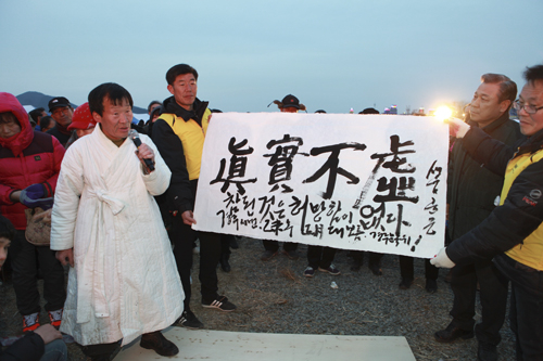 |  | | | ↑↑ 달집을 태우며 김성재 선생이 필사한 휘호를 설명하고 있다. | | ⓒ GBN 경북방송 | | 오후 6시 사회자의 구호에 맞춰 달집살이가 시작됐고 행사에 참석한 시민과 관광객들은 저마다 소원지를 달집에 던지며 가정의 안녕과 나라의 무사평안을 기원했다.