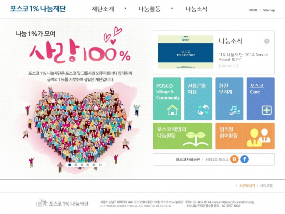 한편 포스코1%나눔재단 홈페이지가 3월 3일 새로운 모습으로 리뉴얼했다.
