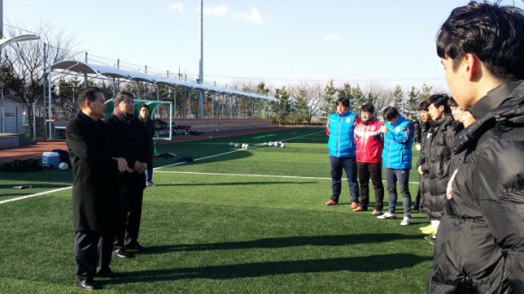 상주상무프로축구단 이정백 구단주와 백만흠 대표이사가 4일 상주국민체육센터 축구장에서 대한민국 축구의 미래를 위해 굵은 땀방울을 흘리며 기본기를 다지고 있는 유소년 선수단을 방문, 선수들을 격려했다. 초‧중‧고 유소년 선수 90여명이 모인 이 자리에서 구단주와 대표이사는 유소년 선수단이 지난 1월 열린 ‘2015년 금석배 전국 고등학생 축구대회’와 ‘제16회 탐라기 전국 중학교 축구대회’ 에서 각각 ‘우승’과 ‘준우승’의 우수한 성적을 거둔 것에 대한 노고를 치하하며, 초등부 유소년 선수들에게도 선배들의 뒤를 이어 훌륭한 선수로 성장하여 줄 것을 당부했다. 지난 3일 이사회와 대의원총회를 거쳐 상주상무프로축구단의 새로운 대표이사로 선출된 백만흠 대표이사는 “아직 어린 나이지만 결의에 차 있는 유소년 선수들의 눈빛을 보고 많은 감명과 대한민국 축구의 미래를 본 것 같다”며, “축구의 꿈나무들이 무럭무럭 성장하여 상주시뿐만 아니라 대한민국을 빛낼 수 있는 우수한 선수들로 성장할 수 있도록 최선을 다해 지원할 것”이라고 말했다.
