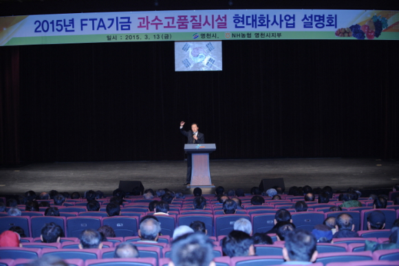 영천시(시장 김영석)는 13일 영천시민회관에서 사업대상자 600여명이 참석한 가운데 2015년 FTA기금 과수고품질시설현대화사업 설명회를 개최했다.