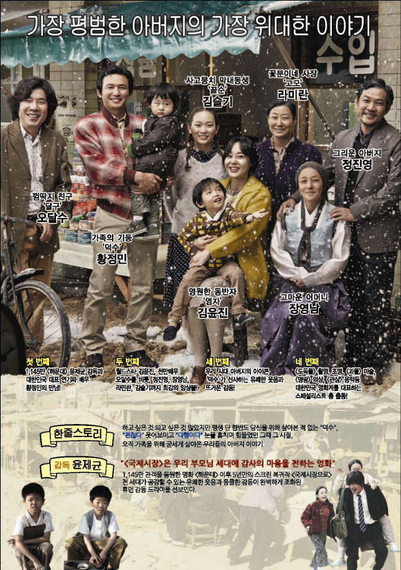 윤제균 연출, 배우 황정민, 김윤진, 오달수 주연의 영화 ‘국제시장’은 ‘괜찮다’ 웃어 보이고 ‘다행이다’ 눈물 훔치며 힘들었던 그때 그 시절, 오직 가족을 위해 굳세게 살아온 우리들의 아버지 이야기를 그려낸 작품으로 전쟁 · 피난 · 죽음 · 이별로 인한 수많은 아픔을 낳은 ‘1950년 한국전쟁과 흥남철수’, 이후 피난민들의 삶의 터전으로 자리 잡은 거리 ‘국제시장’을 무대로, 실업문제 해소와 외화획득을 위해 펼쳐졌던 ‘1960년대 서독 파견 간호사와 광부’ 그리고 ‘1970년대 베트남 파병’을 거쳐 전 국민을 울음바다로 몰아넣었던 기적의 순간 ‘1980년대 이산가족 상봉’까지 생생하게 그려냈다.