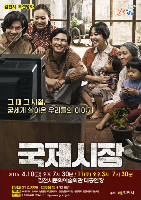 김천시에서는 시민들에게 건전한 여가선용과 즐거움을 선사하기 위하여 특선영화 『국제시장』을 4. 10(금) 오후 7시 30분과 4. 11(토) 오후 3시, 오후 7시 30분 3회에 걸쳐 문화예술회관 대공연장에서 상영한다.