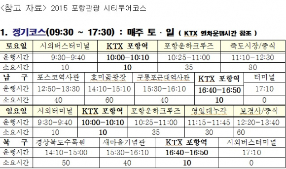 정기코스는 매주 토, 일요일 오전 9시 30분 시외버스터미널에서 출발해 KTX 포항역을 기‧종점으로 운영하며, 요일별 코스일정대로 7시간가량 투어가 진행된다. 코스는 포항운하를 비롯해 죽도시장, 한반도 최동단 호미곶, 웅장한 폭포와 계곡이 아름다운 내연산과 보경사 등 해양문화관광도시 포항의 가장 대표적인 관광지를 담아 알차고 의미 있는 여행이 될 수 있도록 구성했다.