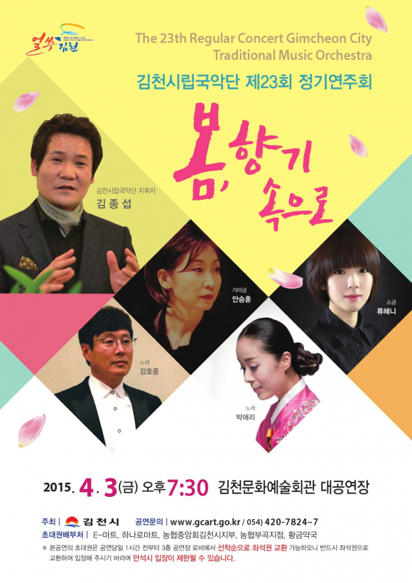 |  | | | ⓒ GBN 경북방송 | | 김천시에서는 김천시립국악단 제23회 정기연주회「봄, 향기속으로」를 2015. 4. 3(금) 오후 7시 30분, 김천문화예술회관 대공연장에서 개최한다.