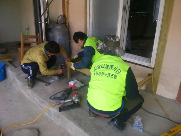 사랑나눔봉사단장인 포항시청노동조합 김삼성 위원장은 “소외된 이웃들에게 따뜻한 사랑의 열기가 전달될 수 있도록 매달 어려운 이웃을 찾아 집수리 봉사활동을 펼칠 계획”이라고 말했다.