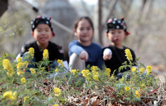 31일 오후 포항시 북구 흥해읍 학천리 도음산 산림문화수련장을 찾은 아이들이 노란 꽃망울을 활짝 터뜨린 산괴불주머니를 신기한 듯 바라보고 있다.