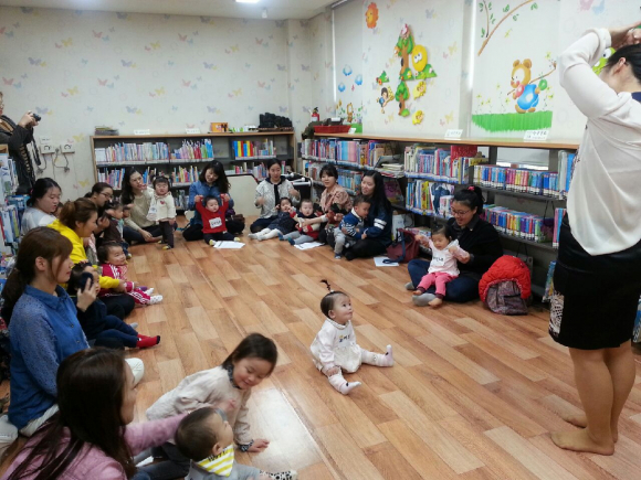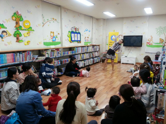 성주둥이들이 “안녕하세요. 반가워요. 사랑해요”로 시작되는 인사 노래에 맞추어 엄마와 함께 율동을 따라하면서 시작한 첫번째 수업은 전문강사의 동화구연과 고운 빛깔 부직포로 만든 다양한 동물손인 형을 활용한 입체적 수업으로 진행되었다. 선정도서는 “꾸벅 인사 놀이”였으며, 참여 대상자에게 그림책2권과 북스타트 가이드북이 든 생애 첫 책 꾸러미를 나눠주었다.