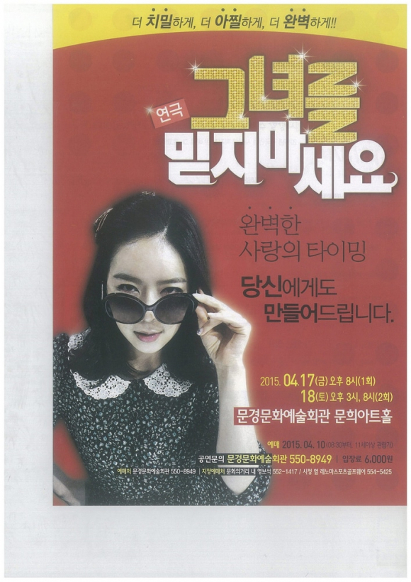 문경문화예술회관에서는 오는 17일(금) 오후 8시, 18일(토) 오후 3시·8시 연극「그녀를 믿지 마세요」를 공연한다.