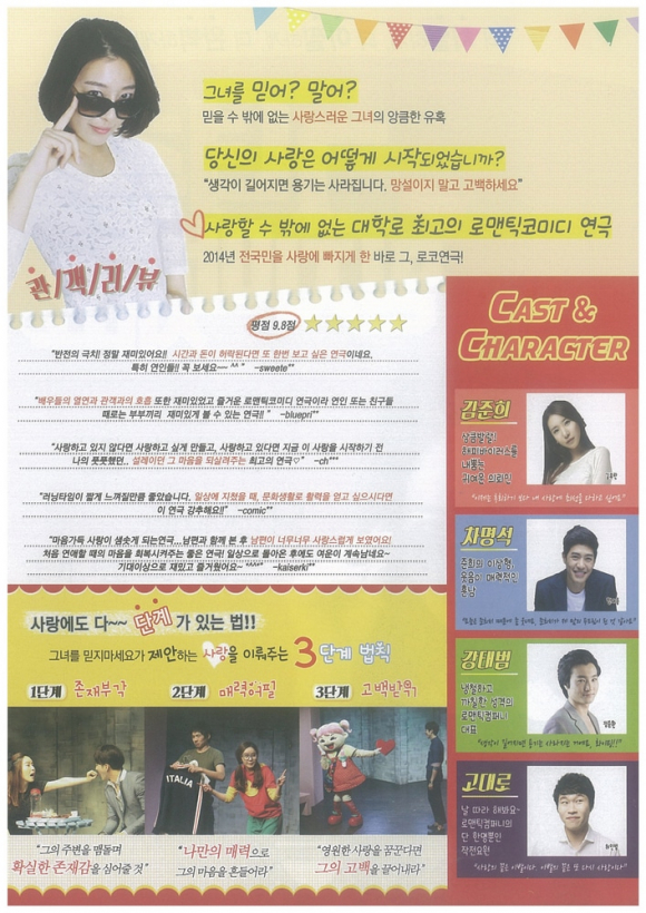 문희아트홀에서 공연되는 이 연극은 실수도 많고, 후회도 많던 당신의 사랑, 연애가 어려운 사람을 위해 연애참고서가 되어줄 로맨틱코미디 작품으로 대전, 광주, 울산 등에서 공연되었고, 2014년 10월 30일부터 대구 앵콜공연을 시작한 대학로 최고의 로맨틱코미디 연극이다.