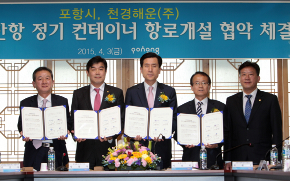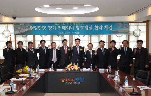 포항시는 3일 시청 중회의실에서 천경해운(주)과 포항영일만항 정기 컨테이너 항로개설 협약식을 체결했다.