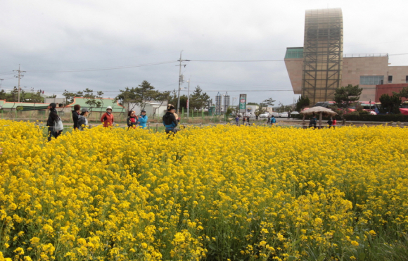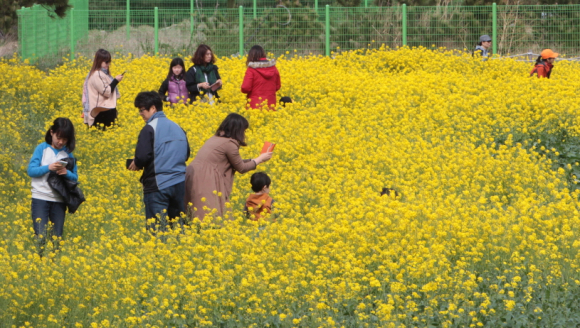 포항 호미곶에 만개한 유채꽃이 관광객들의 발길을 끌고 있는 가운데 나들이 나온 가족들이 스마트폰을 이용해 기념사진을 찍고 있다.
